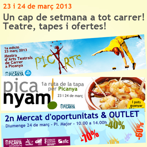 També, entre el dissabte 23 i el diumenge 24 podreu gaudir de "PicaNYAM!, 1a Ruta de la Tapa per Picanya", una inicitiva de diferentes establiments hostalers del nostre poble i l'Ajuntament de Picanya que pretén donar a conèixer el bo i el millor de la nostra gastronomia en format tapa. Podreu trobar fins a 20 tapes en 10 establiments diferents a un preu ben ajustat de 2 euros, tapa i beguda. Una invitació a eixir en bona companyia i recòrrer Picanya a colp de tapa.