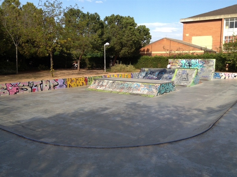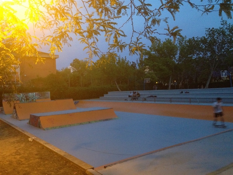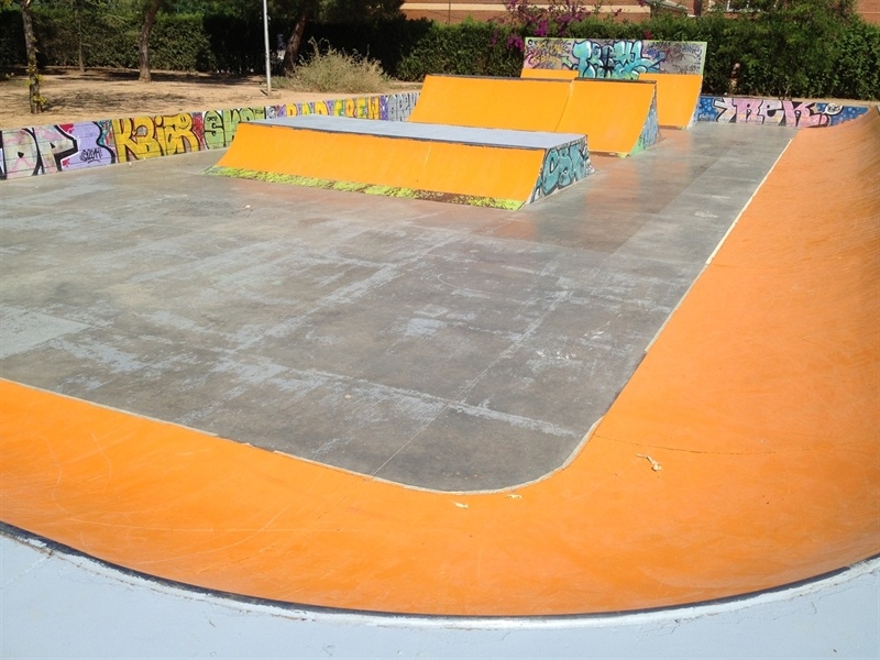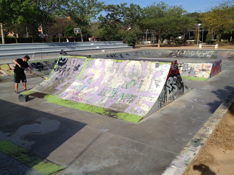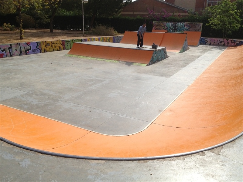 En el cas de la pista de patinatge s'han respectat els grafittis de les parets verticals tot i entenent que formen part de la cultura pròpia d'este esport mentre s'han cobert les rampes en color taronja i les zones planes en color gris.